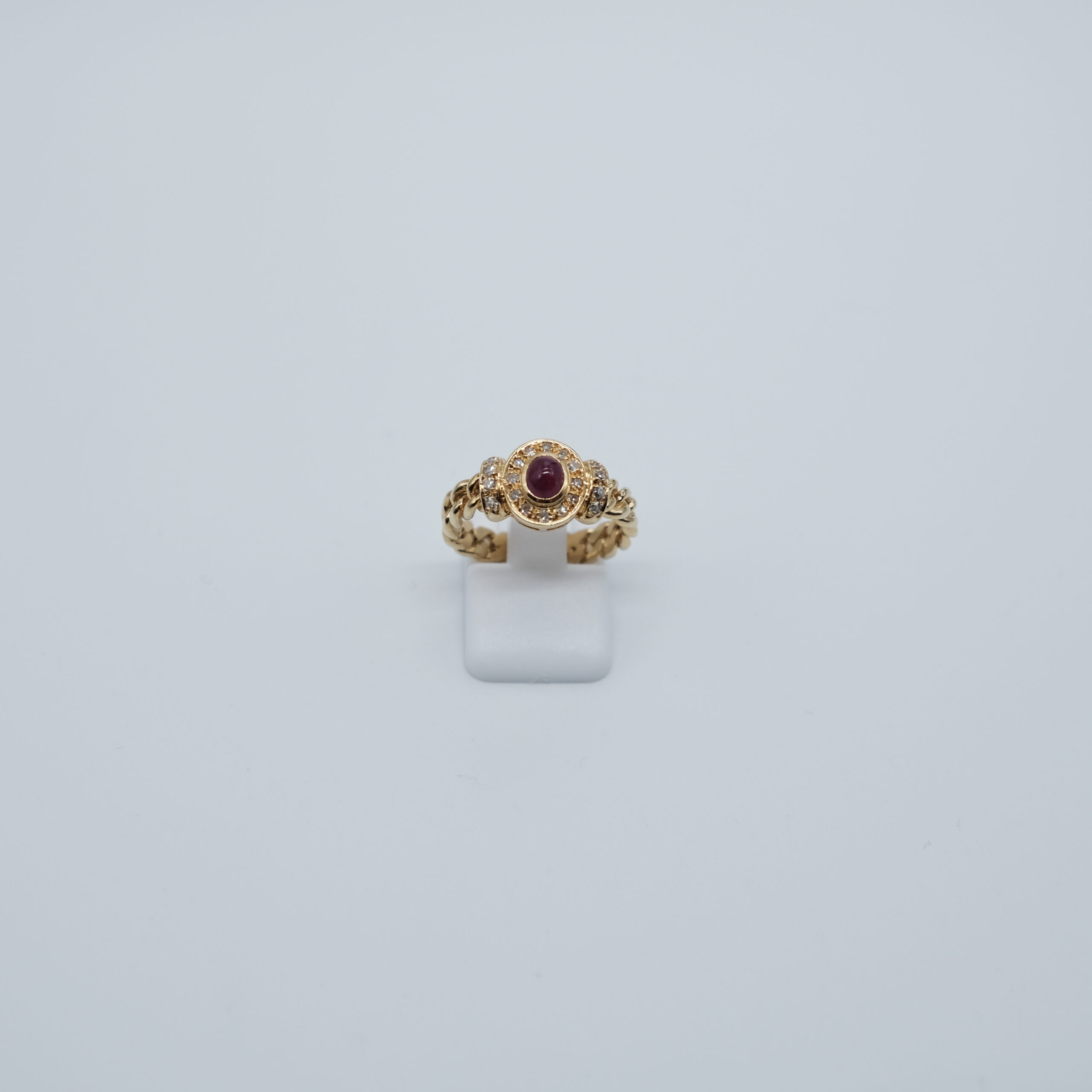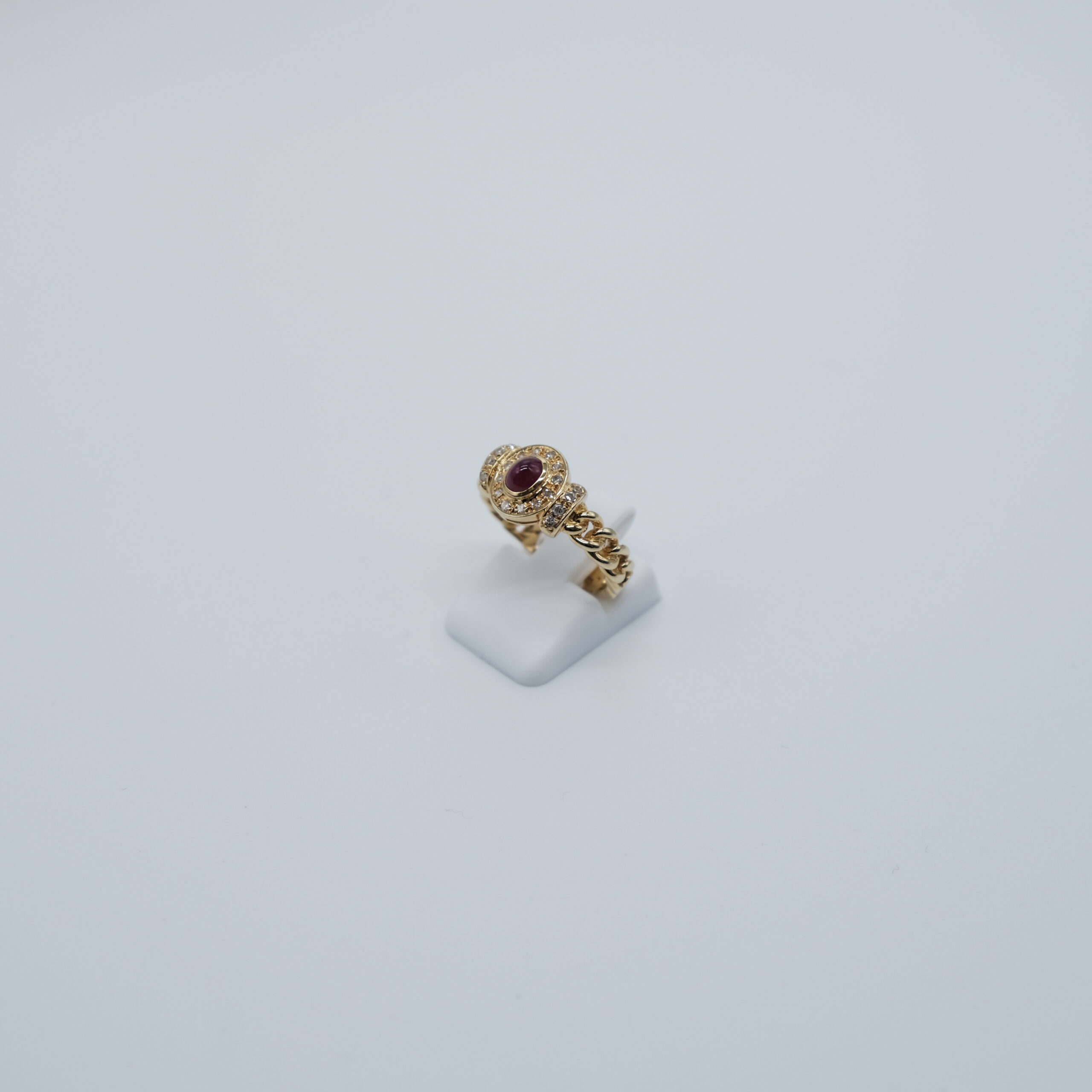 Gelbgold Ring (14K) mit Brillanten und Rubin. Mit Panzerketten-Details.